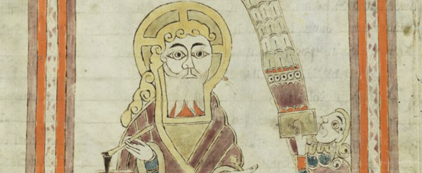 Detail showing St Matthew applying a scribal knife or scraper to a page and dipping his pen in an inkwell (Cod. Sang. 1395, p. 418). © Stiftsbibliothek, St. Gallen