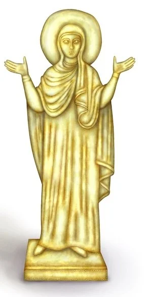 Virgin Mary, ’effigiem . . . in statum’, gilt silver, embossed, commissioned by Pope Paul I (757–67), artistic impression; ©Matilde Grimaldi for Francesca Dell’Acqua, 2025.